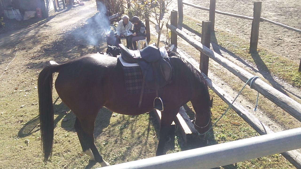 馬を柵に繋ぎ、馬具カタログをご覧になられています![]()